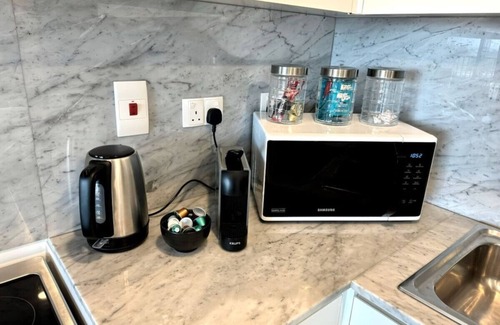 The apartment is fitted with elegant furnishings and beautifully decorated. The kitchen is fully equipped with all necessary essential cooking utensils, dinnerware and appliances including a toaster, kettle, and microwave. Please note that this apartment does not have a dishwasher.