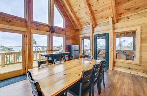 Lake life at its finest awaits at this impressive 6-bed, 4.5-bath Gilbertsville vacation rental cabin! ‘Lake’n Logs’ has an open living area with floor-to-ceiling windows, a full kitchen, private outdoor spaces, and on-site access to Kentucky Lake. Utilize the shared dock or seasonal kayaks and get out on the water! When night falls, unwind on the deck or gather in the game room for a shuffleboard tournament.