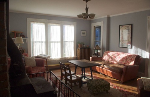 Large home and quiet street, with Parlor, Library, Dining Room, Kitchen and full bath on first floor, four Bedrooms, Sitting Room and Sewing Room, one full and one 1/2 bath on second floor. Small lot with lovely gardens. If you have seen the movie In The Bedroom you have seen our house.