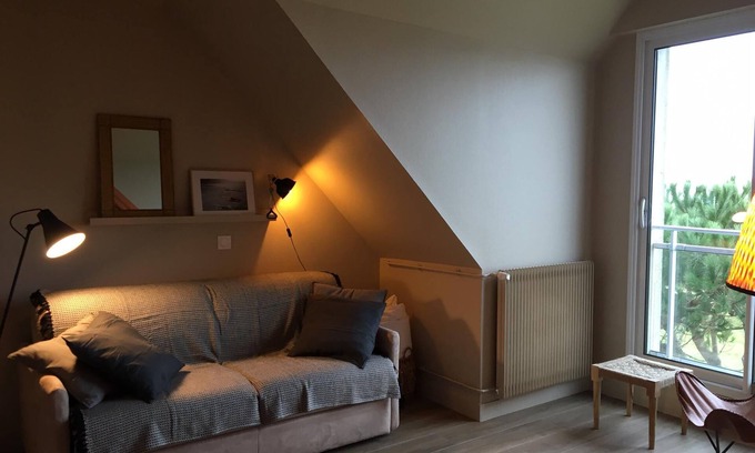 large studio new 2022 sea view beach walk to town center port st guenole in the town of penmarch in southern finistère. very spacious, the studio in an ethnic chic style revisited by an architect, invites you to rest thanks to its zen atmosphere. in addition, you have a small separate alcove which accommodates a single bed. in the studio, the sofa in the living room is convertible equipped with a duvet and bed linen. the kitchen has a dishwasher. the spacious and bright bathroom, with window, offers a bath/shower, a washbasin, small cabinet and towels. the toilets are separate.