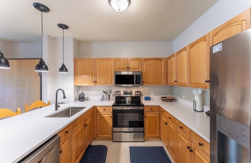 This 1-bedroom, 1-bathroom ground floor condo sleeps 4 with a king bed and a full Murphy bed. It features an updated kitchen, a comfortable living area with a gas fireplace, and a large private balcony with mountain views. The Mountain House Base area and Peru Express lift are only about a 5 minute walk away, or you can take the shuttle anywhere in the resort. Hidden River Lodge offers shared amenities including two hot tubs offering gorgeous slope views and a large outdoor deck with seating.