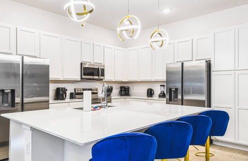 villa features a fully equipped kitchen with a breakfast bar and ample