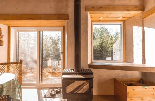Le StrawCastle est fabriqué à partir de balles de paille et enveloppé dans un ciment respirant, ce qui le rend extrêmement efficace, gardant au chaud en hiver et au frais en été. Les murs épais, le plafond en bois voûté, la finition à la main en plâtre de chaux et les grandes fenêtres encastrées donnent à cette unité une sensation de château distincte. Complet avec kitchenette, cheminée, lit queen et canapé-lit, cette construction abrite confortablement 4 personnes.