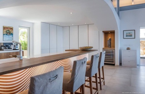 Well equipped kitchen with ocean view. Access to the backyard with integrated pizza oven/grill, pantry and wine cellar, blender, coffee maker, juicer, microwave, toaster, 2 refrigerators, ice maker.