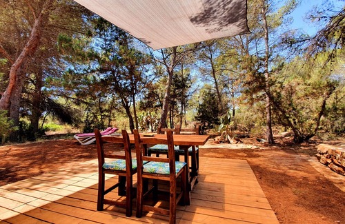Traditional Ibizan construction surrounded by centuries-old Mediterranean pines.