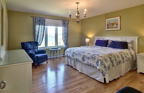 On the ground floor, you will find the kitchen, living room and dining room, all in an open concept offering a splendid view of the lake and abundant light. In the evening, you can relax in the warmth near the wood-burning fireplace or watch your favorite show on a 56-inch TV. The first master bedroom has a queen bed and a walk-in closet. You also benefit from a large bathroom which communicates with the bedroom. It has two sinks and a separate shower.