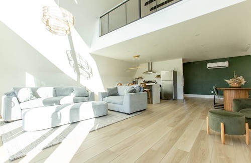 Bedrooms + Sleeping Spaces: The bedroom located in the loft has a king-size bed, and there is a pull-out couch on the balcony as well. There are two bedrooms on the main floor, one with a king-size bed, and the other with a queen-size bed.