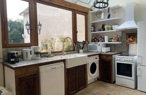 Here you are reading about Leonardo, our grand and beautiful two bedroom, 150m² vacation rental home. The living room and dining room are in a majestic troglodyte space, the bedrooms are in the traditional part of the house, all connected via the kitchen veranda, where you will also find our indoor decorative well. You have a small private patio and we have parking and a delightful garden on the other side of the road. The kitchen has a full size refrigerator and freezer, four burner electric stove top, electric oven, dishwasher and small appliances. There is a shower in the downstairs bathroom and a bathtub in the upstairs bathroom. There is a clothes washer and dryer in the kitchen. There is a large screen TV with internet and Netflix. You have a barbecue on the patio.