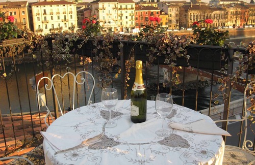Newly open and fully renovated, Leoni House is an elegant apartment located in the historic and quiet heart of Verona, facing the beautiful San Fermo church. Very close to Piazza Erbe, Piazza Brá and Giulietta's house, at walking distance to all the main monuments and 10 minutes by bus from the station. A fully-furnished place equipped with all comforts, hosting up to 4 people. The apartment consists of one large shiny living room, a fully equipped kitchen, large double bedroom, bathroom with walking-in shower and bathtub and storage room. An exclusive-use romantic roof terrace provides an astonishing view of the Adige River and Verona centre while you enjoy a drink or meal. Equipped with air conditioning, LCD satellite TV, free high-speed secured Wi-Fi, dish washing machine, iron and ironing board, microwave, toaster, kettle, hair dryer, washing machine. A double sofa bed is also available.