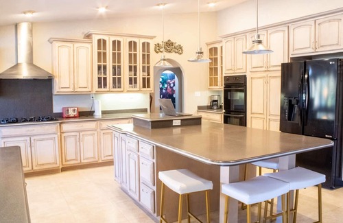 Located 8 min east of MGM Grand, enjoy this 4000 sq ft 5-bdrm heated* pool home. Gold-themed with Las Vegas show decor. Has projector room, billiards, poker, X-men arcade, smart TVs, granite, travertine, custom cabinets, cotton sheets, gel pillows, dual HVAC, shutters, blackout curtains, & dining area.