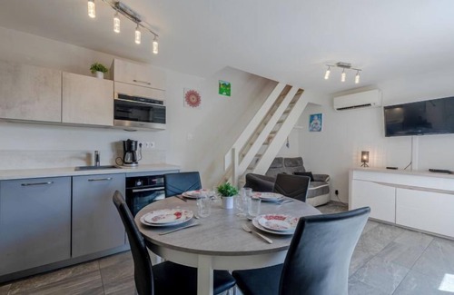 3-room apartment 40 m2 on 2 levels, on the ground floor. Beautiful furnishings: living/dining room with TV (flat screen). Exit to the terrace. 1 room with 1 french bed (1 x 160 cm, length 200 cm). Open kitchen (oven, dishwasher, 3 induction hot plates, toaster, kettle, microwave, electric coffee machine). Shower, sep. WC. Air-conditioning. Upper floor: 1 room with 1 double sofabed (1 x 140 cm, length 190 cm). Terrace 15 m2. Terrace furniture. Facilities: washing machine. Internet (WiFi, free). Parking. Please note: 1 small pet/ dog allowed. Smoke alarm. Offer by a private individual according to Art. 155, IV of CGI. FR6640.270.5