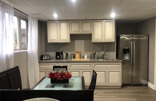 The open space living room includes dining table that comfortably fits 4 people as well as coffee bar with microwave, full size fridge, electric kettle, drip coffeemaker, Tassimo coffee machine (pods also provided), dishes/cutlery and other necessities. Please note, there is no stove, hotplate or other cooking appliance in the suite. BBQ is always available however.