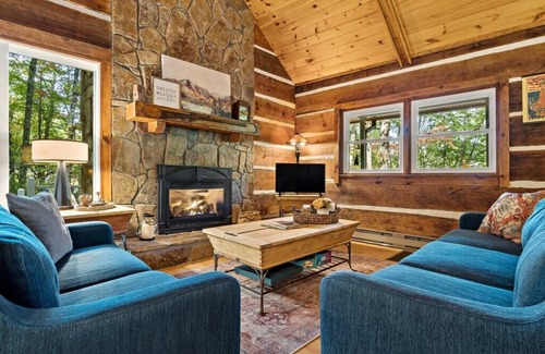 New Superhost Rental!!! Relax with the whole family at this immaculate, peaceful log cabin. Roam the wooded two acres, enjoy the serenity from our large front porch. Warm yourselves in the winter at our indoor gas fireplace or simply relax and help yourself to beverages at our Coffee/Tea bar in the dining area. Art/gaming/reading area for the little ones at the upper level landing and games under the coffee table in the living room for rainy days or a night in. Dogs welcome!
