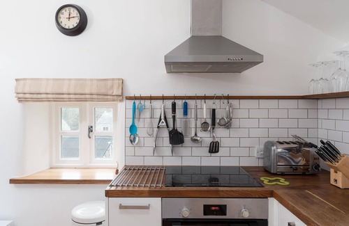 The well equipped kitchen has everything you’ll need to rustle up a Cornish feast, within sociable reach of the open plan living space. There is an electric oven, induction hob, dishwasher and classic Cornishware, Le Creuset pans and Dualit appliances. The gorgeous little Welsh dresser is an eye-catching feature and there is a rustic dining table with benches for long leisurely dinners where conversation flows into the night. On that note, if you’d like a special event catered for, do ask as we have some superb contacts.