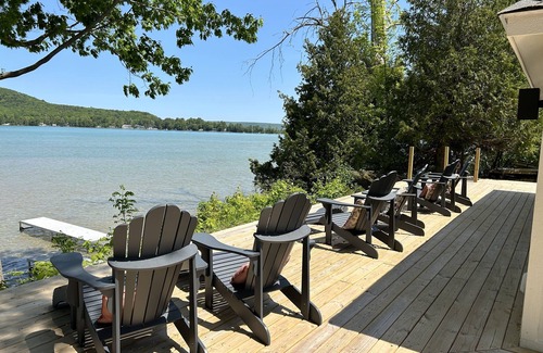 New, gut rehab Little Glen house with 100 feet of lake frontage. 2 bedroom, 1 full bath that sleeps 6. Panoramic views of Sleeping Bear Dunes and Alligator Hill. Huge outdoor deck to relax and admire the sweeping views. Includes a dock and boat mooring. 5 minute drive to Glen Arbor.