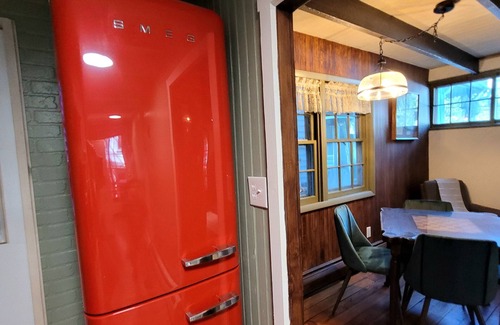 LIVING ROOM – Bright living room and DINING ROOM combination with windows overlooking Mount Gretna United Methodist Church, wood beamed ceiling with brand new hardwood flooring and lighting. Minimally decorated with a modern couch, comfortable accent chair, and large Smart TV. The dining room table has a built-in checkerboard! Mini-split air conditioning unit (central air) and woodstove. This cottage features a stunning floor to ceiling, hand-painted mural of Mount Gretna on the wall – a must see!