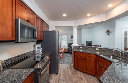 Recently updated, this townhome features three floors of slopeside living. Step inside through a large entryway, providing ample room for gear storage, which leads into the main living area. The centerpiece of the main living space is the large updated kitchen, perfect for preparing group meals and catching up on the day's events. Equipped with modern amenities including an electric oven/range, refrigerator, microwave, dishwasher, and plenty of dishes, pots, pans, and utensils, this kitchen has everything you need. Adjacent to the kitchen is a dining room comfortably seating 8, with additional seating at a bar-height counter. A sunny living room, centered around a wood-burning fireplace, and a cozy TV area offer relaxation. A half bath rounds out the main level.
