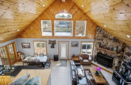 No 'roughing it' here. Rent this gorgeous house, fully-equipped, built in 2001, 3 bathroom, on-suite master bedroom with whirlpool tub, gameroom, sunroom, fireplace, airconditioning, stove, microwave, oven, dishwasher, 2 refrigerators with ice-making, ice-dispensing thru door, washer & dryer (no extra charge), loft, 6 bedroom lake home rental with a boat dock and frontage on quiet area of Pine Lake connected to Lake Holcombe. Boat launch, sandy beach (15 minute walk) and golf course within 2 miles. Easy access to snowmobile trails.