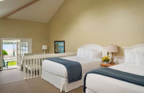 Retreat to our comfortable air-conditioned LODGE ROOM with 2 Queen beds. Curl up in front of the gas fireplace and watch your favorite show on the 40-inch flat-screen TV or connect with friends and family back home, courtesy of the complimentary Wi-Fi. You'll find a mini-fridge stocked with Poland Spring water and a Keurig coffee maker with an assortment of Green Mountain coffee and tea. In the evening, enjoy a glass of wine while sitting in the Adirondack or rocking chairs located on the private covered porch, which leads to beautifully landscaped grounds and views of the waterfront.