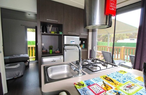 Discover without delay this new rental broken down into 2 modules communicating by the wooden terrace with a living area of 75 m² this cottage has a capacity of 11 people: 1 master suite with kitchen and living room & a module of 2 suites with kitchen and living room.