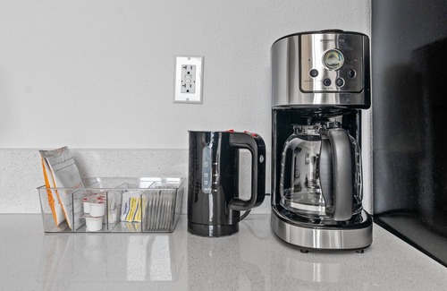 • Chef-ready kitchenette with induction cooktop, microwave, tall fridge-freezer, Ninja Foodi (10-in-1 pressure cooker + air fryer), cookware, and dinnerware