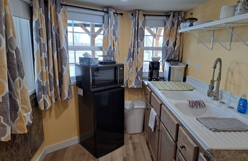 We have a gravel driveway which services our house and the cabin. You park next to the cabin. There is a kitchenette with the necessary essentials and a small bath with a shower and toilet. There is also heat and AC.