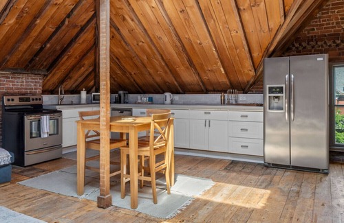 SPACE: This stunning 2-bedroom, 1.5-bath apartment effortlessly blends contemporary style with historic charm. The airy loft features cathedral ceilings, exposed beams, and skylights that drench the space in natural light. Enjoy an open-concept layout ideal for gatherings, a fully equipped gourmet kitchen, and spacious bedrooms with luxurious linens. The private rooftop deck provides breathtaking views of Portland’s skyline—ideal for sunset cocktails or stargazing.