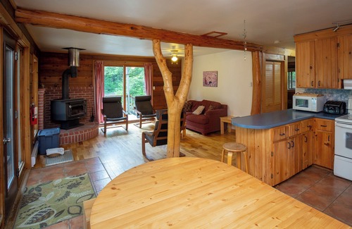 The open concept living / dining room / kitchen overlooks Harry Lake. The wood stove provides a cozy atmosphere and the Maple Tree trunk in the center of the room enhances the natural setting.