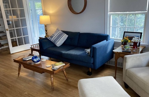 4 Houses from the beach, sunroom, outdoor patio, LR, DR , sun drenched with WiFi, cable , hardwood floors, stocked kitchen 2Bed/2 Bath. Enchanting, deep manicured yard. Seasonal/holiday/ getaways.