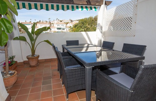 Three bedroom, two bathroom duplex apartment situated in Los Flamencos complex which is front line beach. The apartment has it's own wifi connection, air conditioning , 2 upstairs bedrooms (one with a private terrace), 1 downstairs bedroom and a terrace with evening sun and views to the Puerto de la Duquesa gardens. There is also underground parking and access to the communal swimming pool.