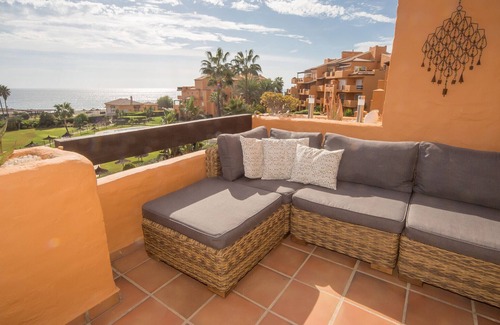 Well furnished two bedroom corner apartment and come with wifi and air conditioning. The fully fitted kitchen and two full bathrooms with walk in showers have both recently been renovated in a clean, modern design. The spacious lounge has patio doors leading on to the balcony which is furnished with both dining furniture and casual seating. The balcony also has views of the gardens, pool and sea.The complex is located on the beachfront with a large lagoon style swimming pool set in spacious grounds. The complex also has underground parking, 24hr security and is a short walk along the beach to the fishing village of Castillo and Duquesa marina.Communal facilities are subject to availability.