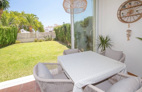 Two bedroom, one bathroom ground floor apartment. Completely refurbished this year in a modern style the lounge has patio doors leading to a covered terrace area and then to a lovely sunny, large garden. The apartment has a fully fitted kitchen, it's own Wifi connection and is air conditioned throughout. Situated in the Los Pelicanos complex which is located just outside the marina so offers a quiet location but is just a short walk to the beach and marina with it's wide selection of bars and restaurants. There is also an allocated parking space within the gated community.The complex also has a communal swimming pool included.Communal facilities are subject to availability.
