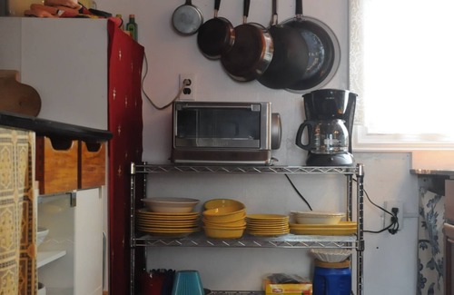 The house sleeps eleven people. It has two bedrooms on the 2nd floor and the living room there is a futon couch that will sleep two, the front porch has a twin bed for one, and the den will sleep one on the twin bed/couch and two can sleep on the futon couch - full size. The kitchen is large with many cookbooks. There is a large movie library with two small tvs - one upstairs and one downstairs, a music library, and many books for adults and children. There is vast selection of board games for all ages, puzzles, children's toys, and art supplies.