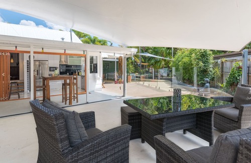 Only 250m back from beautiful Holloways Beach this gorgeous three bedroom beach cottage has been lovingly refurbished. Full kitchen, full laundry, work desk, internet and three queen sized beds. Split system air conditioning in every bedroom & lounge. A large sofa in the lounge. Huge fridge/freezer with water dispenser and ice maker. An amazing outdoor entertaining set up with multiple shaded dining, BBQ, and lounging areas. Beautiful large pool to cool off in. Public transport, local cafes and shops including take away and liquor stores are literally right on the doorstep of this fantastic home.
