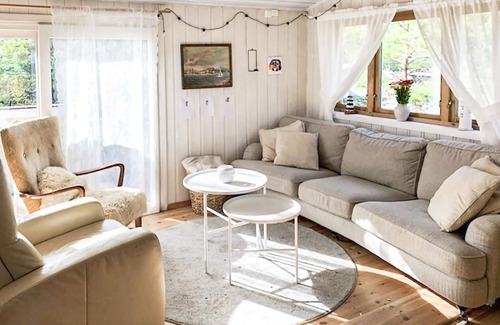 Close to the shore of the Oslofjord, this beautiful vacation home welcomes you in a green, sheltered location. Inside, a bright and friendly interior awaits you. Spend cozy evenings in the nice living room and warm yourself in front of the fireplace after a day in the fresh air. The comfortably equipped house also offers an annex, so even larger families will find enough space.