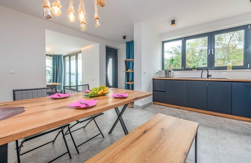 Travel to the island of Ugljan and spend an unforgettable vacation right by the water in this tasteful vacation home. The modernity, furnishings and color-coordinated design create a true oasis of well-being that promises you wonderful comfort on two floors. Conjure up delicious meals in the kitchen or relax in the cozy bedrooms and read a book on the balcony while you gaze out over the sea. Sit together on the terraces in the evening, chat and enjoy the view.