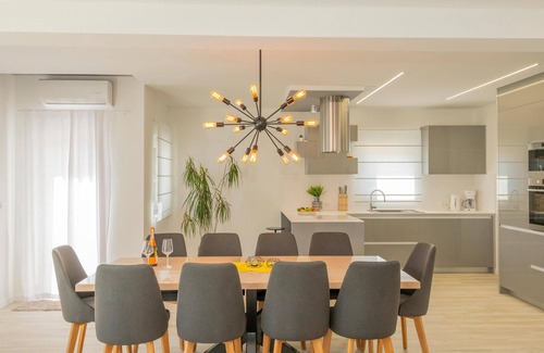 This modern and superbly equipped vacation home with heated pool is located in inland Dalmatia, not far from the Makarska Riviera. The house is fully air-conditioned and consists of a ground floor with living room-kitchen, 1 bedroom, bathroom and recreation room with billiards, table soccer, table tennis, darts and playstation for your entertainment and a sauna next to it. Interior stairs lead you to the 1st floor with 4 more bedrooms and 3 bathrooms. On the 2nd floor there is a spacious terrace with mini-bar, jacuzzi for relaxing and last but not least unforgettable view of Imotski town and lakes in the area. Refreshment on hot summer days can be found in the attractive pool and for your palate and socializing there is a summer kitchen with grill. There are also play facilities for children, who can run around carefree on the fenced property. Enjoy the beautiful scenery in this region and discover wonderful pebble beaches on the Makarska Riviera.