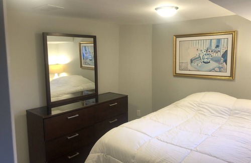 This is a huge basement apartment with two large bedrooms. The two share a large bathroom. The main room is the living area, dining and kitchen. The kitchen is quite cute. It comes with washer/dryer and a large parking space. 2 nice bikes are available.