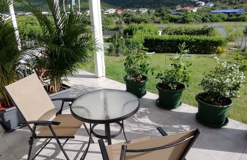 Lovely room and bathroom with a flowery terrace, surrounded by a large green garden, fully equipped with a fridge, tv, internet, AC, king size bed, bedside tables, terrace with chairs and table, in a quiet and green environment, close to the beautiful Friars bay beach, close to Grand case, nice hiking around Happy bay!!
