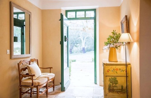 Villa des Maures is a traditional old provençal mas, or farmhouse, nestled in the luxuriant countryside offering total peace and quiet. This Var villa near Saint Tropez is located in the heart of a nature reserve near the village of la Mole in the heart of Provence and the massif des Maures, the \"hills of the Moors\". Constructed over a century ago in the midst of some 50 acres of woods, maquis and vineyards on the edge of a protected forest, the main house is built on a gentle grassy slope with a view of the spectacular hills of Provence. A terrace in the shade of a hundred year old plane tree and its younger offspring provides the comfort of outside living with immeasurable charm. This is the lower terrace. Protected from the winds of the mistral, the mas unites all the qualities of a great manor house decorated in traditional French taste with the amenities of a luxurious home on the shore. The good sized 40’x 20’ pool is hidden away in an island of greenery, allowing children to enjoy themselves without disturbing the peace of those relaxing in the house or on the lower terrace.