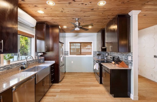 Step into your own private oasis: a sparkling pool surrounded by tropical landscaping, tall palms, and cozy shaded spaces. The covered lanai is perfect for lounging, working, or al fresco meals. Fire up the BBQ and enjoy evening dinners with ocean breezes and glowing sunsets—your backyard resort awaits.