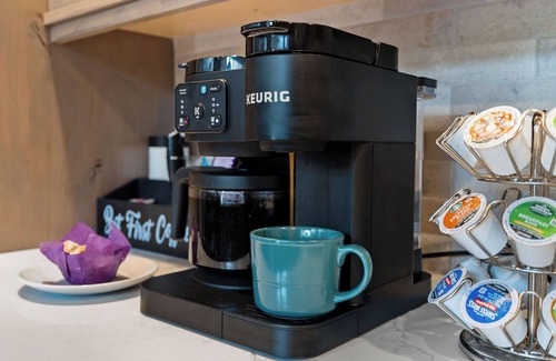 The gourmet kitchen sits right off the living room and dining room areas. There's room to keep your groceries in the cabinets and stainless steel fridge, use the gas range to make homemade meals from scratch or heat leftovers in the microwave. Enjoy using the coffee bar for freshly brewed coffee, the toaster, blender, InstaPot, or any other gadgets to make your family's favorite meals and treats. Dining area seats 8.