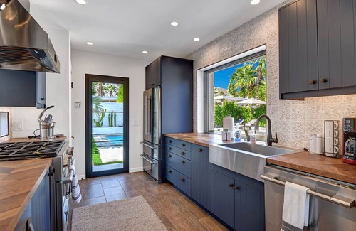 Gourmet Kitchen: A fully loaded wide-galley masterpiece with stainless appliances including a 6-burner gas range and digitally controlled wine-chiller, patterned wood countertops, farm basin sink, hanging pot rack, indoor/outdoor pass-through bar window, and walk-out access to the grill, outdoor dining area, and pool courtyard. Everything you need to prepare and serve a fabulous meal is provided.