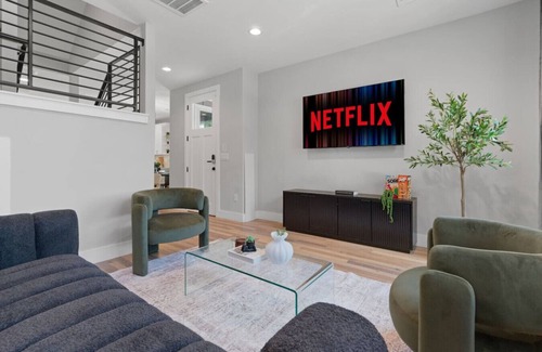 Unwind in our bright, open-concept living area, featuring plush sofas, designer furnishings, and a 65` 4K Smart TV perfect for movie nights or sports watching. Or take advantage of a dedicated working space well suited for business or corporate travelers!