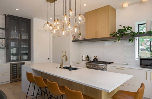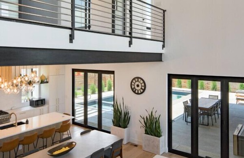 The dining area is perfect for enjoying a meal with your group and guests. The indoor dining table has enough chairs for 10 guests with an additional 5 seats at the kitchen island! The room flows effortlessly into the spacious lounge, with massive windows, 30-foot ceilings, and California doors directly to the outdoor area. Whether you want to open up your laptop to plan adventures for the day, host a dinner, or just want to take things easy, this open-concept living room gives you all the space you need.