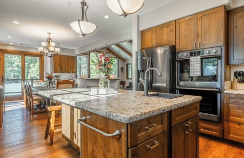 The expansive 2-car garage provides ample storage for gear, whether you're visiting in summer or winter. After a day of adventure, unwind in the private hot tub, or enjoy some friendly competition with games of foosball. With seven flatscreen TVs, surround sound throughout, and high-speed WiFi, this 3,500 sq. ft. home is equipped with all the modern amenities needed for a comfortable and extended stay in the mountains.