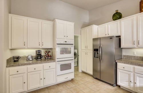 Casa Del Sol is a completely private residence that includes an open floor plan with upgrades. The high vaulted ceilings, recessed lighting, custom paint, and ceiling fans throughout the home. There's plenty of room in the fully equipped large kitchen with granite counters, gas stove-top, double oven, microwave, dishwasher, coffee pot, under cabinet lighting, bar stools and all the necessary utensils for you to enjoy during your stay. Kitchen opens to the great room and features a breakfast bar and formal dining area. Great room is prefect to entertaining and offers beautiful wood floors, 70 inch SMART TV, fireplace, vaulted ceilings, recessed lighting, and double doors to your private outdoor oasis. A laundry room with washer, dryer, as well as a 2 car garage are available for your use.