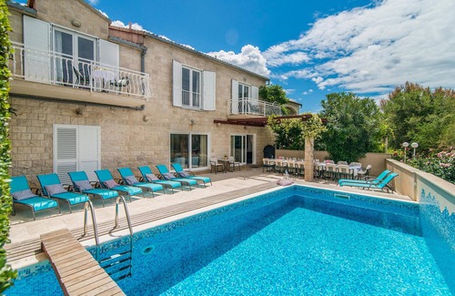 On the first floor of the villa there are 6 rooms and 5 bathrooms. Of the 6 bathrooms in the villa, 4 ensuite bathrooms have a bathtub, and two ensuite bathrooms have a shower cabin. Additional beds are available for guests: 2 sofas (80x190), in two rooms with a large double bed that can be separated into single beds if necessary. From the room, you can go directly to the spacious terrace, which is just a few steps away from the sea, or to the balcony with a view of the beautiful Adriatic. You can also enjoy the sea view while sunbathing on one of the 12 deckchairs by the villa's pool. The pool is heated from the end of April to the beginning of October. The pool is outdoors and temperature is affected by the weather conditions
