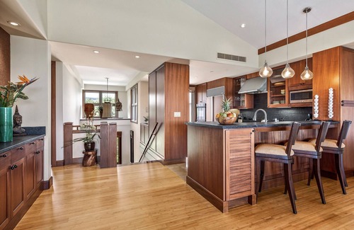 The capacious living room, dining area, and kitchen occupy the upper level. Vaulted ceilings, upgraded bamboo flooring, sleek furnishings and natural light complement the villa's open layout. Bold and minimalist, warm and earthy, a contemporary Asian aesthetic is expertly woven into the art and design throughout the home. Large flat screen TV and ample plush seating, dining table for six, and bar stools facing into the gourmet kitchen make this area the inherent social hub of the home. Pocket doors open out to the large upstairs lanai with seating for eight. Unwind and gaze out over golf course grounds, lava rock, and colorful foliage to the Pacific Ocean and glorious sunsets beyond. The kitchen offers high end appliances, bountiful countertops, plenty of storage area, and a view of the sea from the kitchen sink. A built-in office nook with printer/scanner/copier resides at the far end of the kitchen with double doors that lead out to a cheerful breakfast balcony.