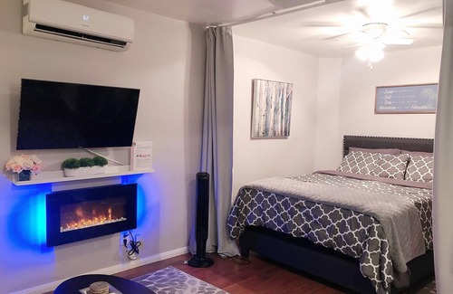 This guest house is clean, bright and designed for optimal comfort. It is private, in the back of the main house with two separate, private entrances. Luxurious amenities with security measures and ease of use with your own personalized gate and door code. Self-check in with ease no matter how late you arrive. Our walkway and lighting are motioned sensor and well lit. The unit is equipped with technology and entertainment such as Netflix and Amazon Prime, Ductless wall Heat and AC and WiFi.
